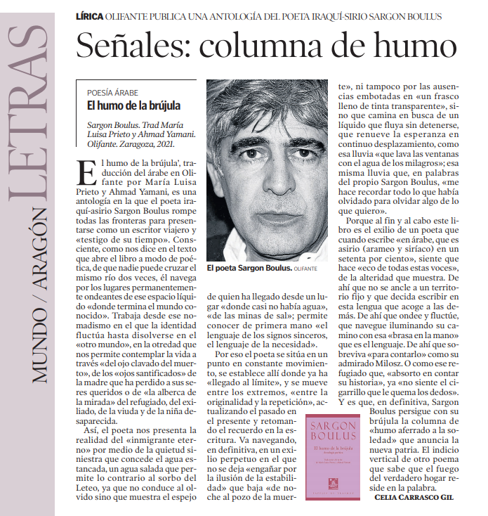 El humo de la brújula, traducción del árabe en Olifante por María Luisa Prieto y Ahmad Yamani, es una antología en la que el poeta iraquí-asirio Sargon Boulus rompe todas las fronteras para presentarse como un escritor viajero y «testigo de su tiempo». Consciente, como nos dice en el texto que abre el libro a modo de poética, de que nadie puede cruzar el mismo río dos veces, él navega por los lugares permanentemente ondeantes de ese espacio líquido «donde termina el mundo conocido». Trabaja desde ese nomadismo en el que la identidad fluctúa hasta disolverse en el «otro mundo», en la otredad que nos permite contemplar la vida a través «del ojo clavado del muerto», de los «ojos santificados» de la madre que ha perdido a sus seres queridos o de «la alberca de la mirada» del refugiado, del exiliado, de la viuda y de la niña desaparecida.